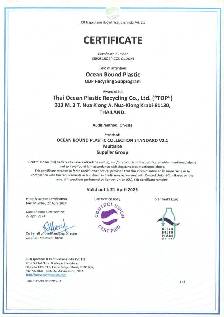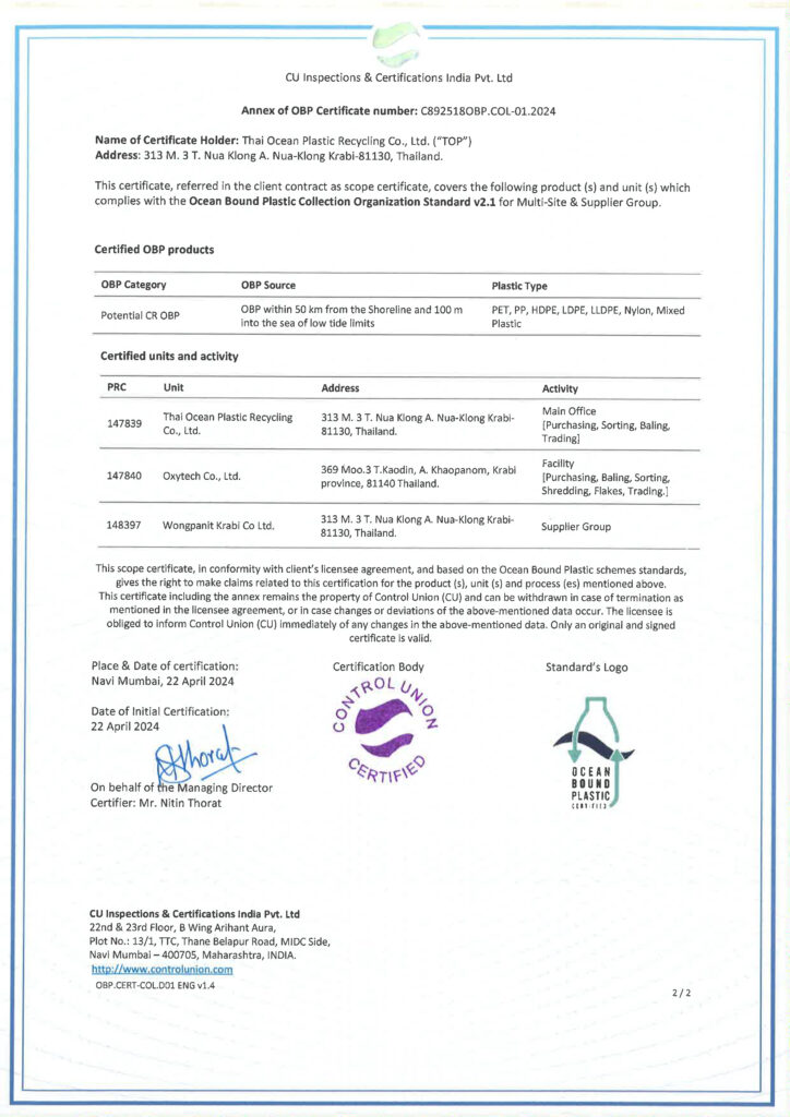 Through our strong motivation and hard work, Thai Ocean Plastics Recycling has its own trustworthy reward for Ocean Bound Plastic Collection Organization Standard V2.1, from the Control Union Certified—a certificate showing our proof of honest transparency and traceability for Ocean Bound Plastics waste. Please help us congratulate those who earn it all as a company; we deserve it all.