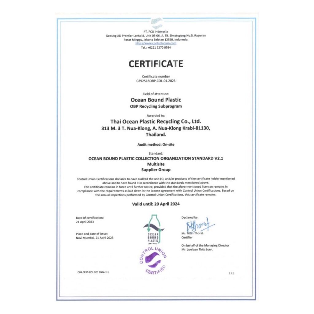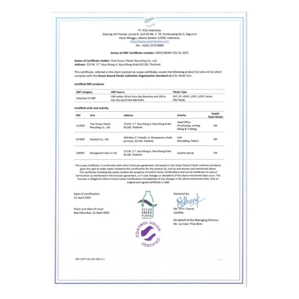 Through our strong motivation and hard work, Thai Ocean Plastics Recycling has its own trustworthy reward for Ocean Bound Plastic Collection Organization Standard V2.1, from the Control Union Certified—a certificate showing our proof of honest transparency and traceability for Ocean Bound Plastics waste. Please help us congratulate those who earn it all as a company; we deserve it all.